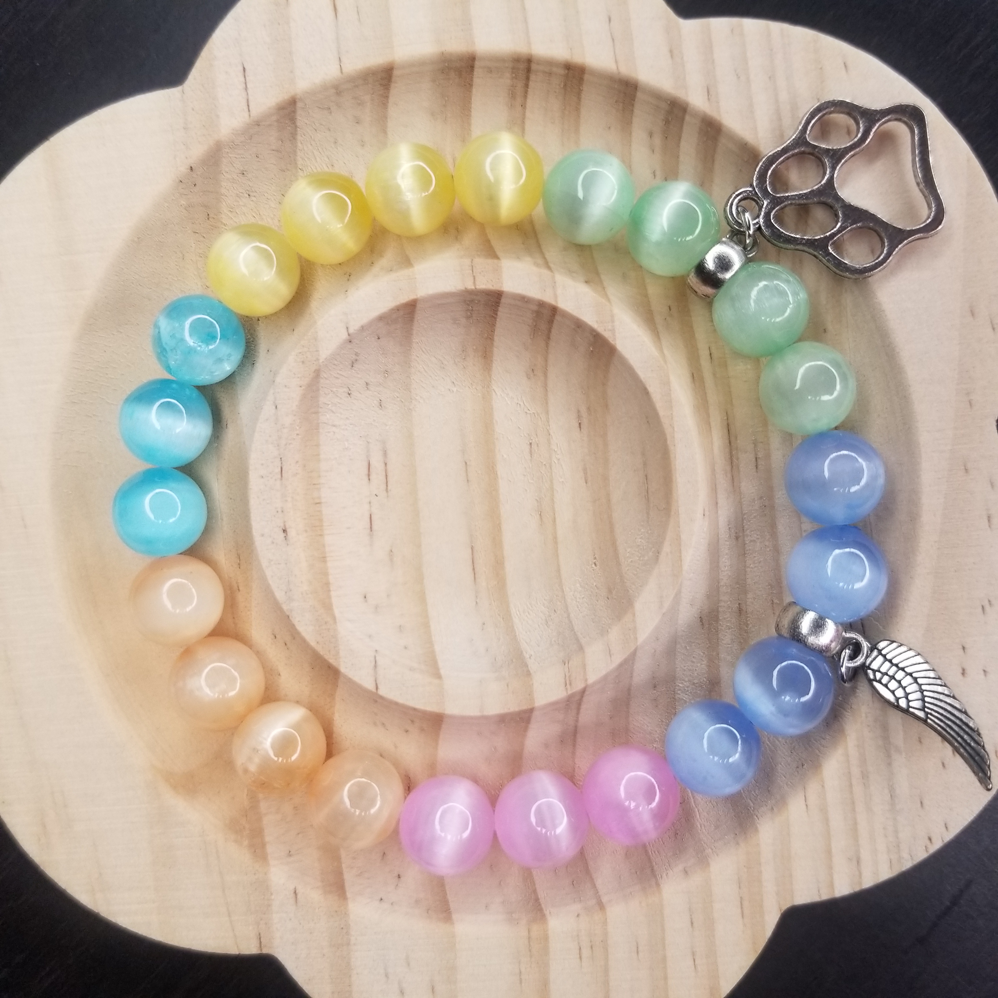 Remember and honor your fur baby with these genuine stone stretch bracelets. Each bracelet is made to order with love and care. Each with its own unique property and quality. Round 8 mm Genuine stone beads. Includes a paw print charm and wing made of alloy. Nickel and lead free. Available in 7", 8" and 9" length.